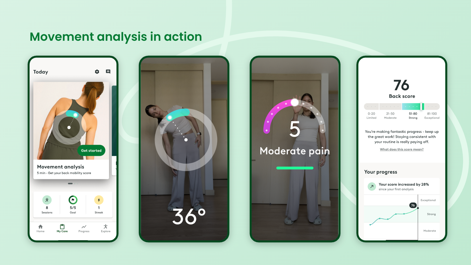 There are many measurement tools to track outcomes in MSK care; while valuable - almost all rely on subjective questions and are therefore self-report only. Hinge Health’s new Movement Analysis uses TrueMotion® computer vision technology to guide members through targeted movements - capturing joint angles, symmetry, and endurance. Pairing those objective measurements with targeted questions creates first-of-its-kind Hinge Scores for joint health. This enables members to monitor their own progress and their relative performance compared to others. Meanwhile, clinicians gain a uniquely composite view to make faster, more impactful, and personalized treatment decisions.